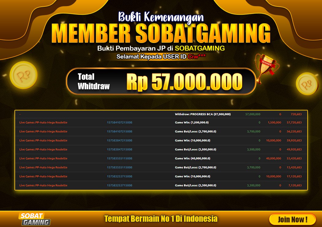 BUKTI JP1 30 DESEMBER 2024 LUNAS RP. 57.000.000,- : Selamat Kepada Member Yang Mendapatkan Maxwin Dipermainan Live Games Mega Roulette, Berikut Kami Postingkan Bukti SS Jackpot Kemenangan Member Setia Sobatgaming